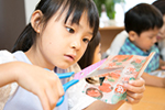 身近な、チラシや雑誌などの切抜を使ったワークです。 食べ物やおもちゃなど、好きなモノを選び、同じ仲間どうし分類をして遊びます。発達段階に応じて子どもたち自身に好きなモノを切り抜いてもらうことで手先の器用さを養いながら、「いる・いらない」を選択する力やグルーピングする力を育てます。 分類ワークは他にも、連想ゲームのような問いかけをしながらグルーピングを学ぶワークショップなどもあります。